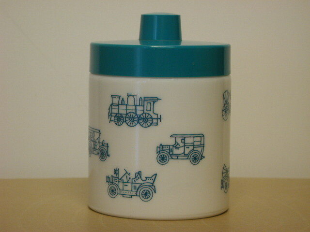 - BeschrijvingWitte glazen voorraadpot voor De Gruyter mocca oploskoffie met plastic binnendeksel en turquoise deksel. Op de pot staan in turquoise diverse afbeeldingen van auto's.