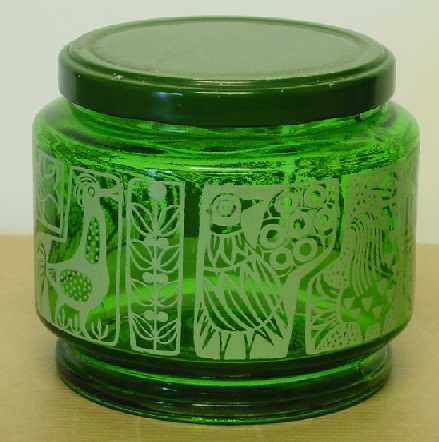 - BeschrijvingRonde pot voor De Gruyter Mokka oploskoffie van groen doorzichtig glas met elf lichtgroene tekeningen van vogels erop. Op de pot zit een platte, ronde, groene metalen schroefdeksel. De pot is leeg.