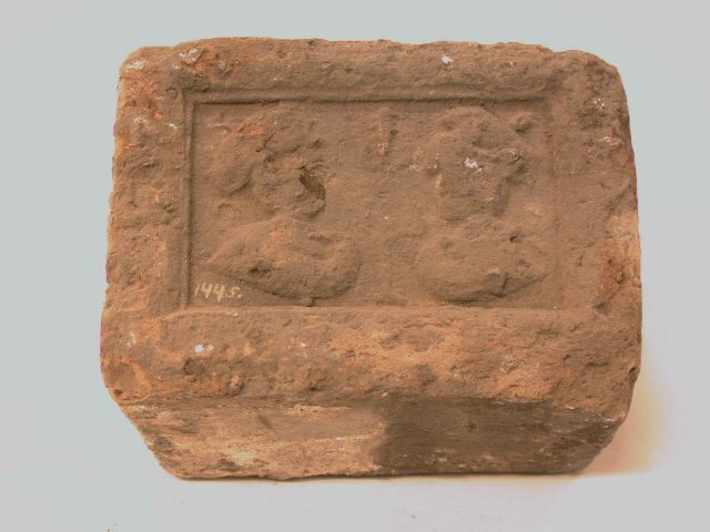 - BeschrijvingTwee toegewende hoofden met tulband-achtige hoed of haarnet en kraag met touwlus aan achterzijde en krullende punt voorzijde. Links man of vrouw, rechts vrouw. Tussen de hoofden een lelieachtige bloem. Halfbrede rand met twee profielbanden.
