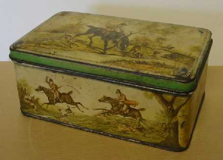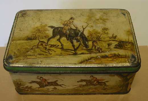 - BeschrijvingRechthoekige metalen trommel met scharnierend deksel. Op trommel en deksel staan jachttafrelen afgebeeld. Volgens documentatie is het blik uit 1955.