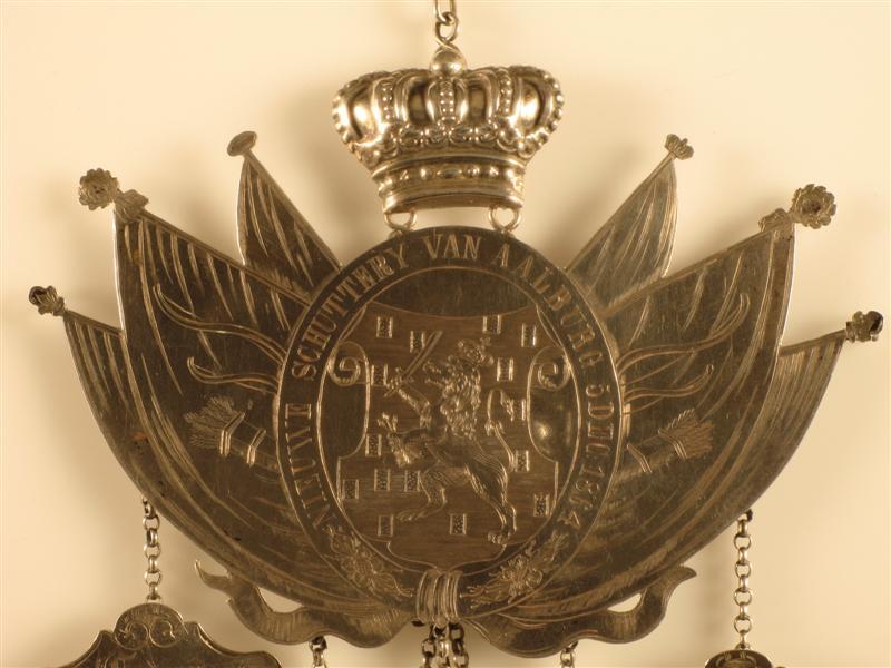Plaquette met afbeelding van het Nederlandse wapen op geblokt schild, binnen ovaal medaillon. Op de laatste inschrift: 'NIEUWE SCHUTTERY VAN AALBURG 5 DEC:1864". Rond medaillon gegraveerde vaandels, 2 pijlenkokers en 2 handbogen. Boven plaquette is d.m.v. twee haken een holle gedreven.gegoten koninklijke kroon. Aan deze kroon is een keten bevestigd. Aan de achterzijde van de plaquette zijn aan de onder- en zijkant 7 gaten. Aan 3 daarvan zijn drie reeksen van 5 schilden bevestigd. Aan onderzijde twee kleine kettinkjes.
