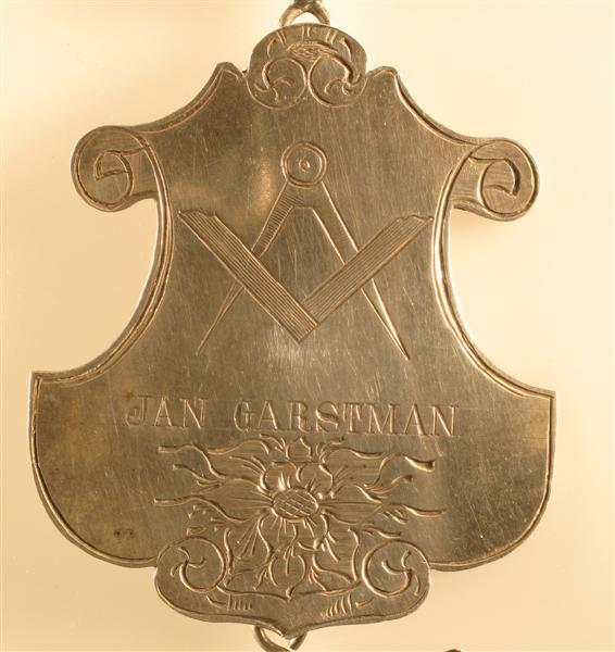 - BeschrijvingSchild met afbeelding van een passer en een winkelhaak. Daaronder inschrift: 'JAN GARSTMAN'. Daaronder gegraveerde bloem. Schild heeft onregelmatige contouren. Midden boven en -onder aan de achterzijde een haak ter bevestiging. langs de rand gegraveerde lijn en voluten ter decoratie.