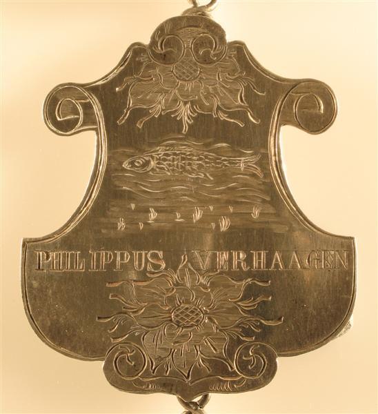 - BeschrijvingSchild met afbeelding van een vis in het water. Daaronder inschrift: "PHILIPPUS VERHAAGEN". Daaronder en boven de vis een gegraveerde bloem. Schild heeft onregelmatige contouren. aan de achterzijde midden boven en -onder een haak ter bevestiging. langs de rand een gegraveerde lijn en voluten ter decoratie.