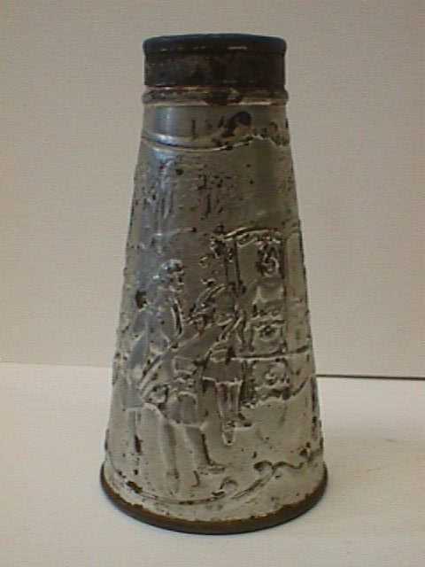 - BeschrijvingMetalen tapstoelopende bus met draaibaar strooideksel om bijvoorbeeld hagelslag uit te strooien. Op het blik staat een afbeelding van een mevrouw in een draagkoets met lakeien erop. De bus is gevuld.