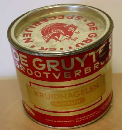 Rond metalen blik De Gruyter grootverbruik specerijen kruidnagelen. Het blik is gemaakt in de kleuren rood en goud. Op de gouden rand in het midden staan twee rode grote zeilschepen. Op de bovenkant van het deksel staat ook een zeilschip. In de onderste rode rand staan twee goudkleurige vrachtauto's afgebeeld. Het blik is open geweest maar bevat nog wel iets van inhoud.