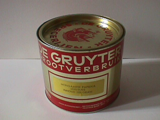 Rond metalen blik De Gruyter grootverbruik specerijen Hongaarse Paprika.. Het blik is gemaakt in de kleuren rood en goud. Op de gouden rand in het midden staan twee rode grote zeilschepen. Op de bovenkant van het deksel staat ook een zeilschip. In de onderste rode rand staan twee goudkleurige vrachtauto's afgebeeld. Het blik is leeg.