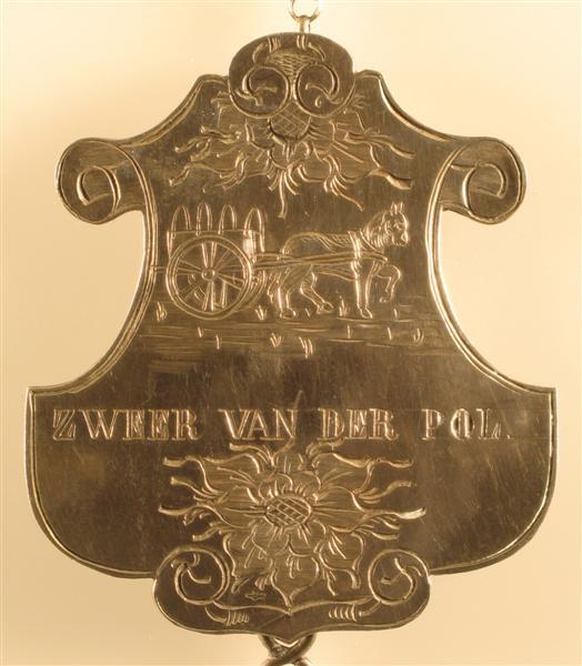 - BeschrijvingSchild met afbeelding van een paard en wagen, naar rechts rijdend. Daaronder inschrift: "ZWEER VAN DER POL". Daarboven en -onder een gegraveerde bloem. Schild heeft onregelmatige contouren. Midden boven en -onder aan de achterzijde een haak i.v.m. de bevestiging. Langs de rand een gegraveerde lijn en voluten ter decoratie.
