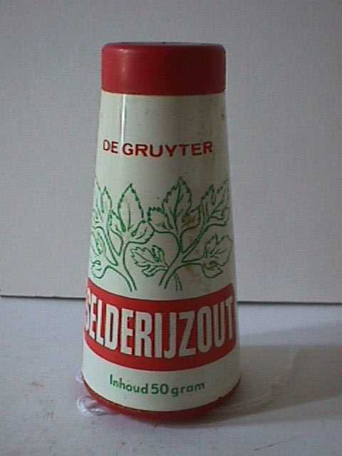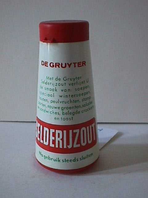 - BeschrijvingKunstof strooibus De Gruyter selderijzout, 50 gram, met op de achterkant een gebruiksaanwijzing. Op de voorkant staan selderijblaadjes afgebeeld. De bus is vol.