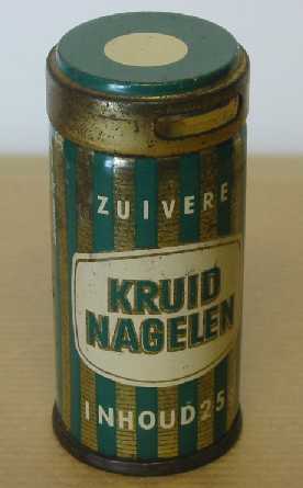 - BeschrijvingMetalen strooibus met draaiafsluiting zuivere gemalen kruidnagelen, 25 gram. Op het deksel staat een witte stip.