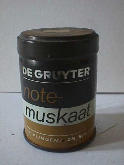 - BeschrijvingRonde, metalen bus notemuskaat met draaibaar strooideksel in de kleuren licht en donker bruin. Het blik is gedeeltelijk vol.