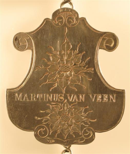 - BeschrijvingSchild met inschrift: "MARTINUS VAN VEEN". Daarboven en -onder gegraveerde bloem. Schild heeft onregelmatige contouren. Midden boven en -onder een haak i.v.m. de bevestiging. Langs de rand een gegraveerde lijn en voluten ter decoratie.