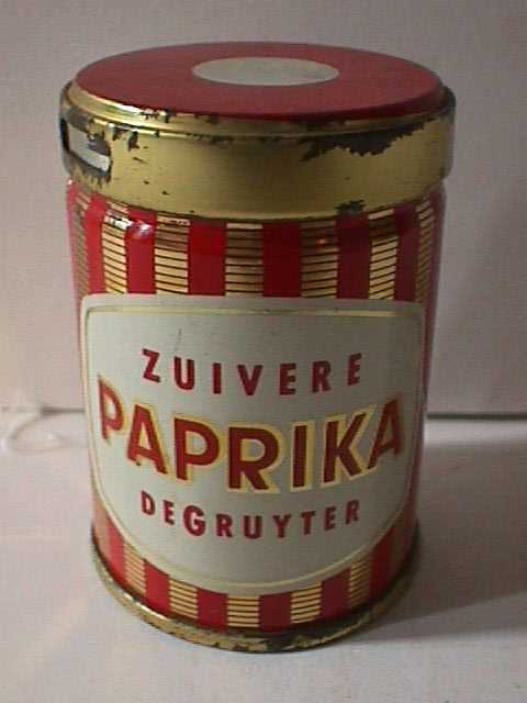 - BeschrijvingMetalen rood-gouden strooibus met draaiafsluiting zuivere gemalen paprika, 50 gram. Boven op de bus zit een witte stip. Het blik is vol.