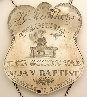 Schild met gegraveerde voorstelling van een timmerman in zijn werkplaats, waar gereedschap aan de muur hangt. Daarop inschrift: "1884/I G Meulkens/2DE KONING." Onder de voorstelling "DER GILDE VAN/ST JAN BAPTIST/TE/WAALWIJK EN BESOYEN." Schild heeft onregelmatige contouren. Aan de achterzijde boven links en rechts en onder links en rechts (4) haken i.v.m. de bevestiging. Langs de benedenrand links en rechts een gegraveerde lijn in een voluut eindigend ter decoratie. Langs de bovenrand links en rechts decoratie in lofwerk.