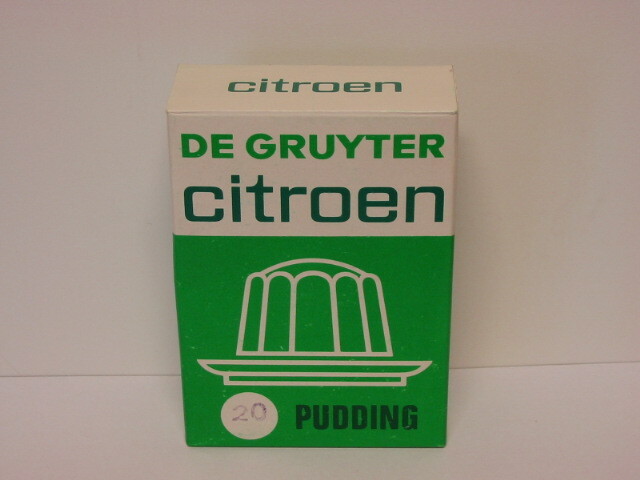 - BeschrijvingDoosje De Gruyter citroen pudding. Het doosje is vervaardigd in de kleuren groen en wit. Op de voorkant staat een pudding getekend, op de achterkant staat de gebruiksaanwijzing. Het doosje is vol.
