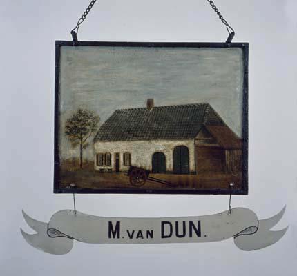 - BeschrijvingVoorstelling: voorgevel van boerenwoning met schuur en handkar op de voorgrond. Voorstelling achterzijde: achtergevel van boerenschuur met huifkar. Opschrift op afzonderlijk ijzeren banderollen aan haken bevestigd: OUD VOERMANS WELVAREN/M. van Dun. Afkomstig uit Vught.