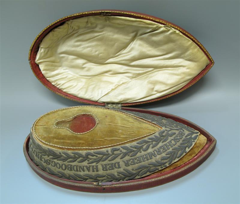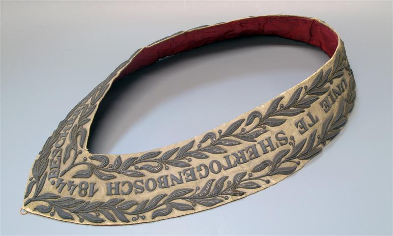 Draagband van naturelkleurig zilverbrokaat met reliƫfborduurwerk in zilverdraad en -pailletjes. Langs beide zijden van de band takken met blaadjes en vruchtjes (oranjeappels?). Daartussen de tekst: "BESCHERMHEER DER HANDBOOGSCHUTTERY DE UNIE TE S'HERTOGENBOSCH 1844." Gevoerd met rode zijde. Aan de onderkant een koperen ring. Met zilveren draagpenning. De band wordt bewaard op een in vorm gesneden houten mal, bekleed met rood fluweel en met uitsparing voor de medaille. Houten amandelvormig etui, bekleed met donkerrood leer, met goud bestempeld. Gevoerd met rood fluweel en cremekleurige zijden satijn. Fluweel bestempeld. Afgewerkt met chenillekoord. Metalen scharnier en slot. Op de binnenzijde is een briefje met de volgende tekst geplakt: "Ludovikus Wilhelmus van den Bosch/ derde en zevende Koning der handboogschutterij/ in de Sositeit de Unie te s Bosch/ Joh/ Theod Luyckx Przd der schutterij/ L F Rooderkerke Sekretaris/ in Kommissie Zijne Majesteit onzen/ geeerbiedigde Koning Willem 2". Met bijbehorende medaille.