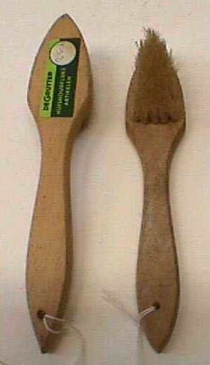 - BeschrijvingHouten schoenborstel met blonde haren. Op de onderkant van de borstel zit een sticker (groen) geplakt met de prijs erop. In het einde van de steel zit een gat geboord.