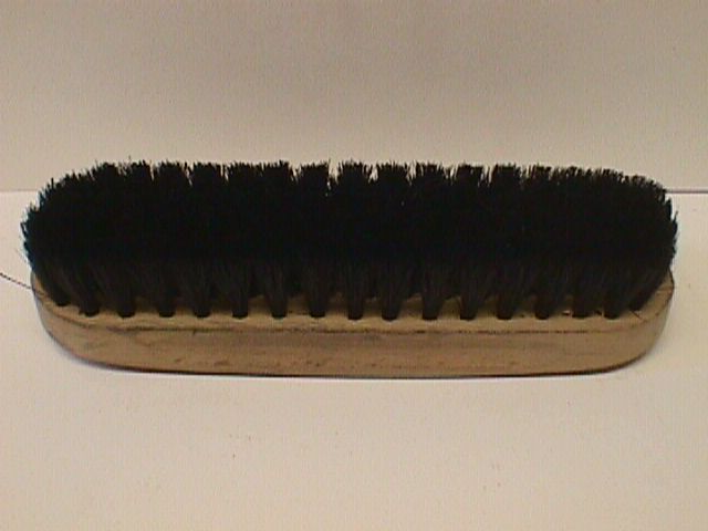 - BeschrijvingHouten borstel met donkere haren. Op de bovenkant van de borstel zit een zwart met rode sticker geplakt met de prijs erop.