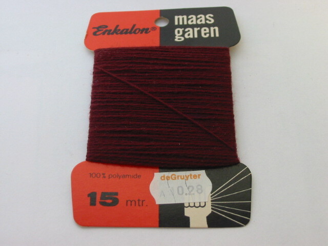 - BeschrijvingStukje karton met daarom heen 15 meter garen eromheen gewikkeld. Het garen is donker rood. Het kartonnetje is rood en zwart. Er zit een prijssticker op het karton.