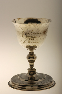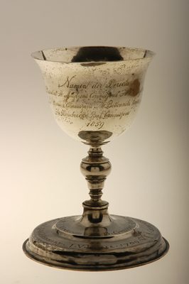 Inscripties op voet: "P. V. BRVGGEN. M. V. VENROOIJ. I. D. GVLIKER. DEKENS." en "I. TRISBAGH. A. V. BEVGEN. I. V. HOMMERT. I. V. HERLE. 1709.. GESWORENS." Tussen "1709" en "GESWORENS" een gegraveerde voorstelling van een blaasbalg, gekroonde hamer en tang (emblemen van het smidsgilde). Inscripties op cuppa: "Namen der Directie/A. van Dijk President H. Muijtjens Commissaris H.P. Verreijdt Secretaris/ J. Richelle kamer Commissaris M. Bettonviele kamer Commissaris/ H. Hendrickx Bal Commissaris/ 1859" en "J. v.d. Linden./president/ 1863/ H Muitjes prsident/ 1867".