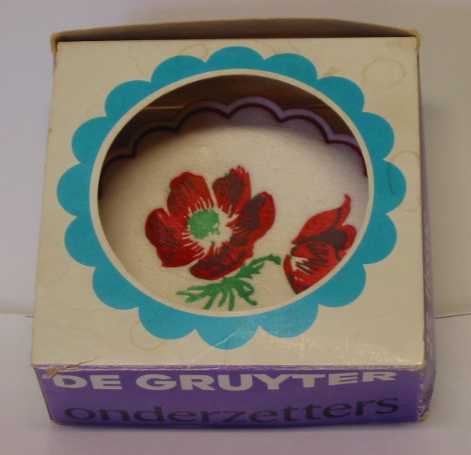 - BeschrijvingPapieren doosje, paars met wit gekleurd. In de bovenkant zit een rond gat waardoor de inhoud zichtbaar is. De inhoud zijn meerdere onderzetters van stof. Op de onderzetters staat een afbeelding van een bloem: klaprozen.