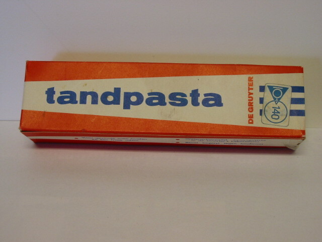 - BeschrijvingKartonnen verpakking voor De Gruyter tandpasta. De verpakking is rood met wit en blauw. Het is een familietube.