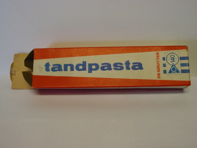 - BeschrijvingKartonnen verpakking voor De Gruyter tandpasta. De verpakking is rood met wit en blauw. Het is een familietube.