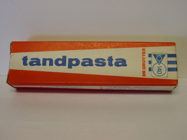 - BeschrijvingKartonnen verpakking voor De Gruyter tandpasta. De verpakking is rood met wit en blauw. Het is een familietube.