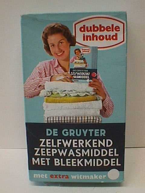 - BeschrijvingBlauwe doos. Op de voorkant staaen afbeelding van een vrouw met bruin haar die op een stapel gevouwen wasgoed leunt en in haar hand een pak wasmiddel houdt. Op de achterkant staat een uitgebreide gebruiksaanwijzing.