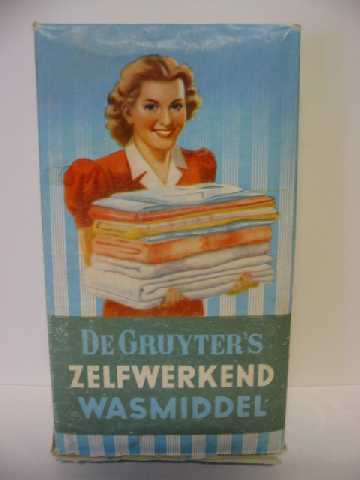 - BeschrijvingBlauwe doos. Op de voorkant staaen afbeelding van een vrouw met blond haar die een stapel gevouwen wasgoed in haar armen heeft. Op de bovenkant staat de slogan van de Gruyter. Op de achterkant staat een uitgebreide gebruiksaanwijzing met afbeeldingen.