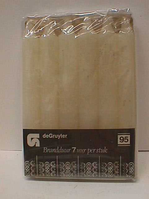 - Beschrijving6 witte kaarsen verpakt in een stuk karton en daarover heen doorzichtig plastic. Het karton is zwart met witte versieringen. De versieringen zijn in verticale rijen een 8 teken met aan beide zijden een maan (met neus) en deze versiering loopt constant door. Op de voorkant staat het logo van deGruyter van na1972.