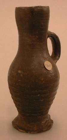 - Beschrijving-geknepen voet -bolle buik met draairingen -lange cylindervormige hals, naar boven iets wijder uitlopend, met draairingen -bandvormig oor aangezet op bovenkant van buik en halverwege de hals -licht- tot paarsbruin zoutglazuur over het grootste deel van de kan