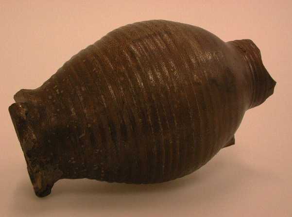 - BeschrijvingZie voor algemeen type nr. 01704 -geknepen voet -ovaalvormige buik met draairingen -cylindervormige hals met draairingen -oorzaanzet op schouder -paarsbruine glazuur met grijze vlekken en een geelbruine loodrechte streep
