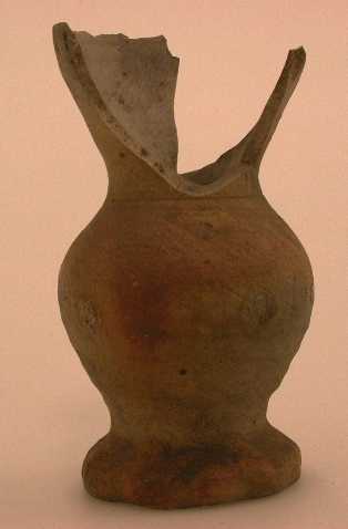 - BeschrijvingZie voor algemeen type nr. 01704. De monding is trechtervorming, het oor op het bovengedeelte van de buik - geknepen voet - bolle buik met draairingen - overgang tussen schouder en hals gemarkeerd door groef - wijduitlopende hals met draairingen - wit steengoed - oranjerode ijzerengobe over grootste deel pot