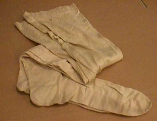 Een paar beige kousen behorend bij het toneelkostuum 'Jan van Glymes'