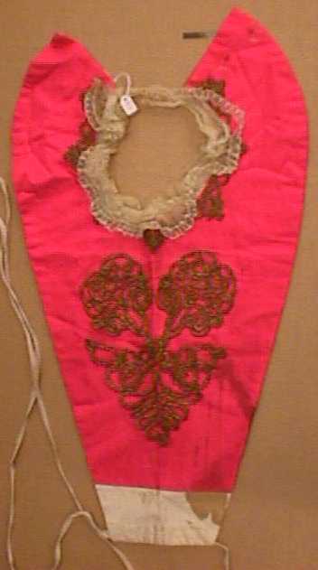 Een front van roze, gladde stof. De kraag is afgezet met kant. Op de voorzijde goudkleurig stiksel in patronen. Aan de onderzijde een lapje witte stof met twee linten. Dit kostuum werd gedragen door jonkheer F.J.J.M. van Rijckevorsel tijdens de maskerade van het Leidse studenten-corpsin 1880. Deze maskerade had als thema 'De intocht van Philips den Schone binnen Amsterdam, 14 juni 1497'. Jan van Glymes was heer van Bergen op Zoom, Walhain, Melyn, Borchvliet, Wouwe en Wavre, kamerheer van Philips de Schone, gouverneur van het graafschap Namen en ridder van de Orde van het Gulden Vlies.
