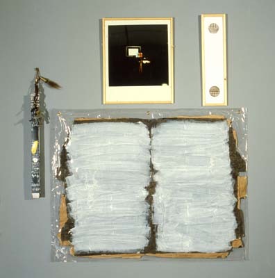 - BeschrijvingBeschilderde voederzak, houten object (beschilderd), uitvergrote polaroidfoto in perspex lijst, ets in perspex lijst.