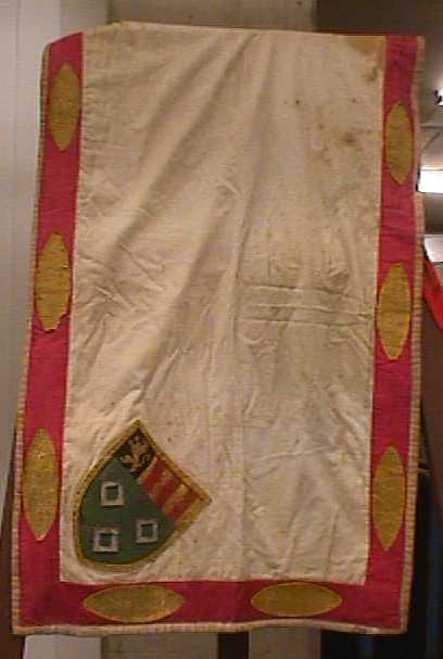 Schabrak van witte stof. De randen zijn roze met ovaalvormige, goudkleurige stiksels. In twee hoeken is een wapenschild aangebracht. Er is een opening. Op de achterzijde zitten rode linten. Dit kostuum werd gedragen door jonkheer F.J.J.M. van Rijckevorsel tijdens de maskerade van het Leidse studenten-corpsin 1880. Deze maskerade had als thema 'De intocht van Philips den Schone binnen Amsterdam, 14 juni 1497'. Jan van Glymes was heer van Bergen op Zoom, Walhain, Melyn, Borchvliet, Wouwe en Wavre, kamerheer van Philips de Schone, gouverneur van het graafschap Namen en ridder van de Orde van het Gulden Vlies.