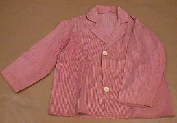 Rood wit gestreept jasje voor een huisknecht. Op het jasje drie witte, grote, ronde kunststof knopen.