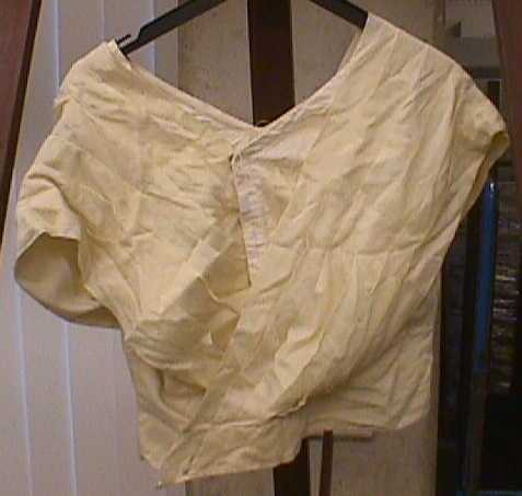 - BeschrijvingCrêmekleurige middag(?)japon. Het lijfje is geplooid en heeft een katoenen binnenlijfje. De losse rok is een geplooide wikkelrok met overslag, in twee etages.