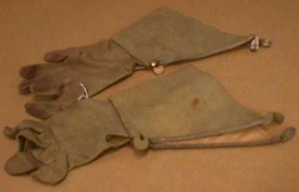 Een paar lange zeemleren handschoenen met lipjes opzij.