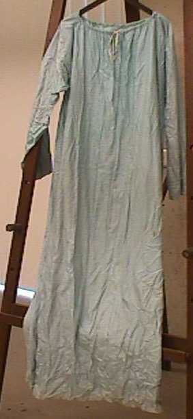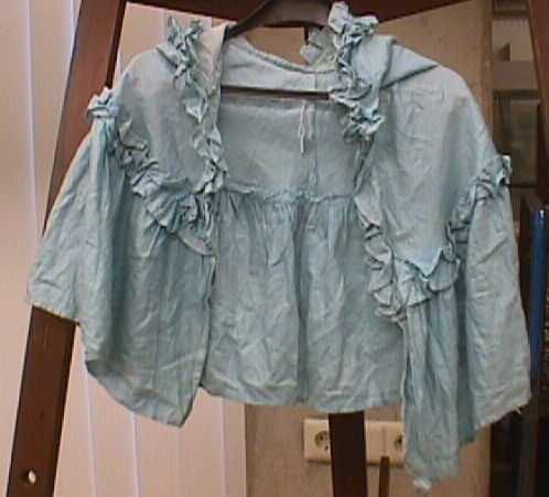 - BeschrijvingEen lange lichtblauwe jurk met bijbehorende kap met pelerine. De kap is versierd met gerimpelde stroken stof en gevoerd met dunne witte stof.