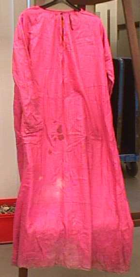 Een lange roze jurk.