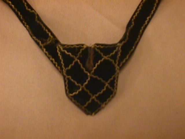 - TitelEen donkerblauwe degenhouder versierd met gouddraad