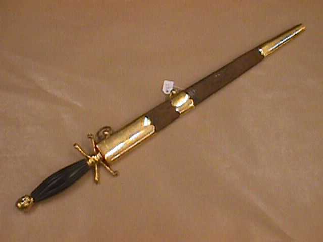 - BeschrijvingEen ponjaard van de vrijmetselarij. De ponjaard heeft een koperen gevest, met zwarte versieringen en doodshoofd en gekruiste beenderen. De kling is zwart met goudkleurige symbolen uit de vrijmetselarij. De schede is van zwart leer met koperen beslag. Een zwarte houder.