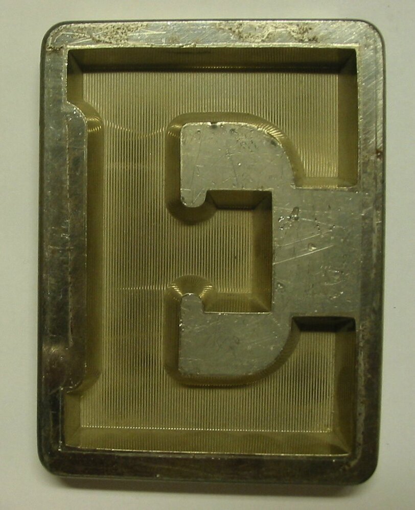 - BeschrijvingRechthoekige metalen vorm bestaande uit een plat vlak met daarin de letter E uitgediept.