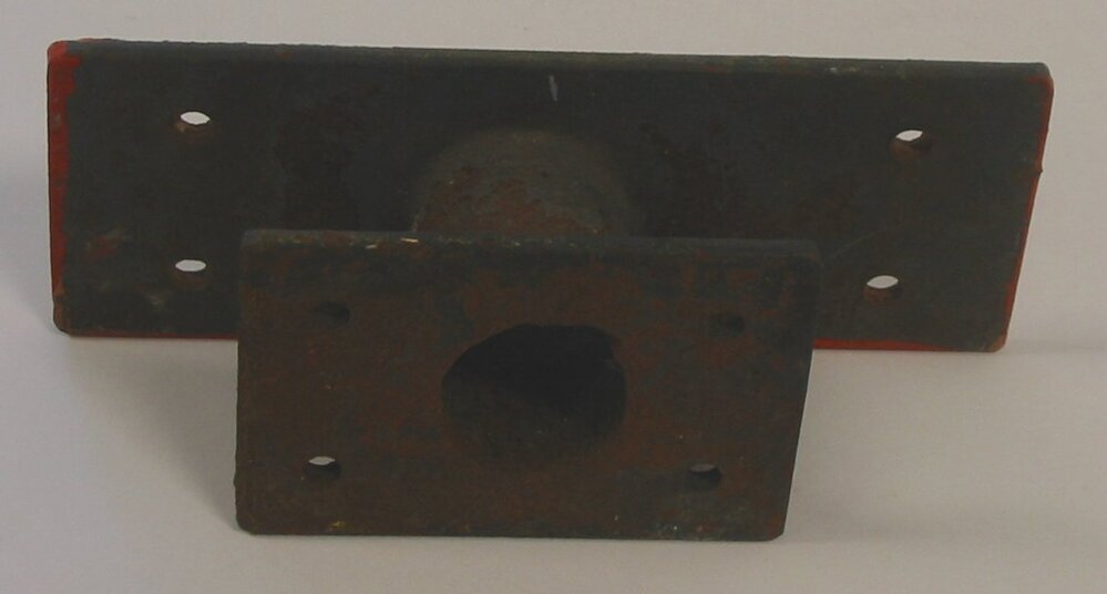 Metalen bevestigingsmiddel met een klein en groot plat stuk verbonden door een buisje. In het buisje zou eventueel een ronde buis of stok gestoken kunnen worden. In beide platte stukken zitten vier gaatjes voor schroeven. Dit object is waarschijnlijk bedoeld om onderdelen van een machine met elkaar te verbinden of om op een ondergrond te bevestigen.