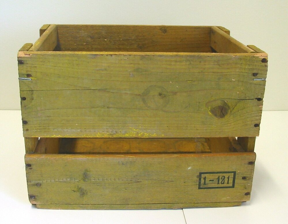 - BeschrijvingGele houten krat, opgebouwd uit 14 plankjes. Waarschijnlijk gebruikt voor het vervoer van flessen.
