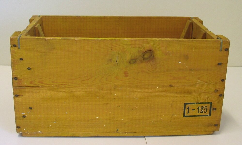 - BeschrijvingGele houten krat, bestaande uit 16 plankjes. Gebruikt voor het vervoeren van 24 De Gruyter bierflessen van 0,3 liter.