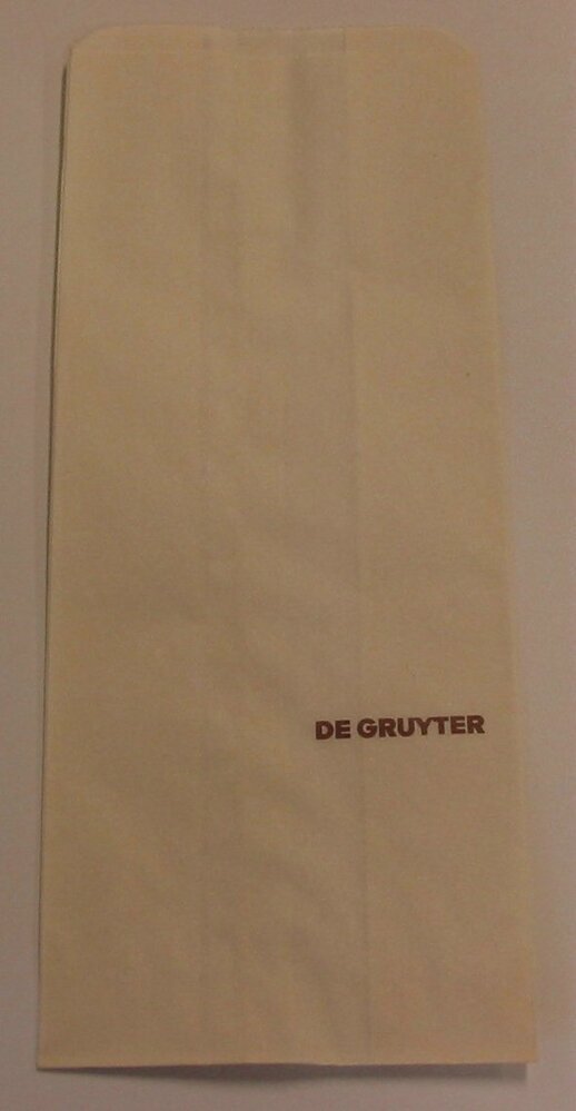 Klein papieren zakje met rechts uitgelijnd een bruin opschrift van De Gruyter.